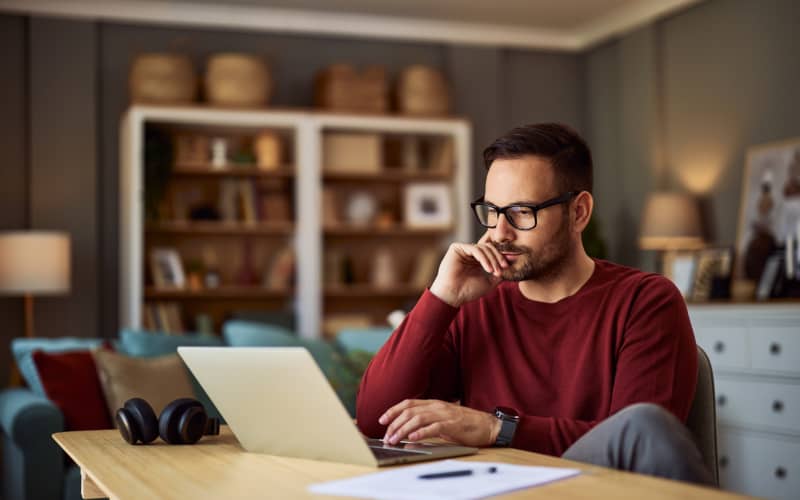 Trabajador autónomo consultando su portátil, en representación de la investigación de opciones de seguro de salud para autónomos.